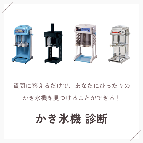 お店でどのようなかき氷をお客様に提供されたいのか、性能や特徴の違いなどの判断基準から質問に答えるだけであなたにぴったりのかき氷機を見つけることができます。